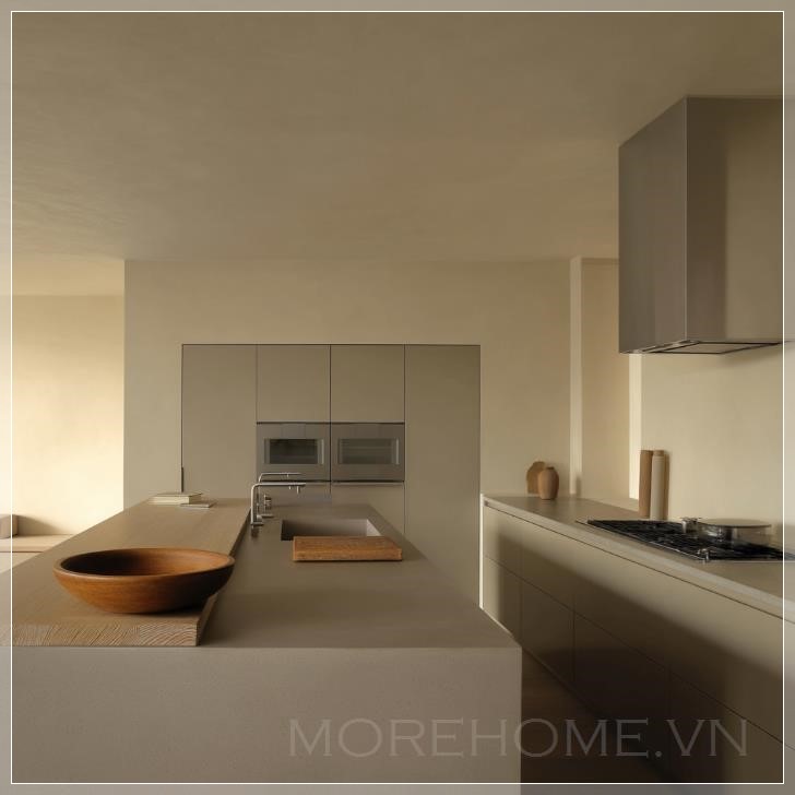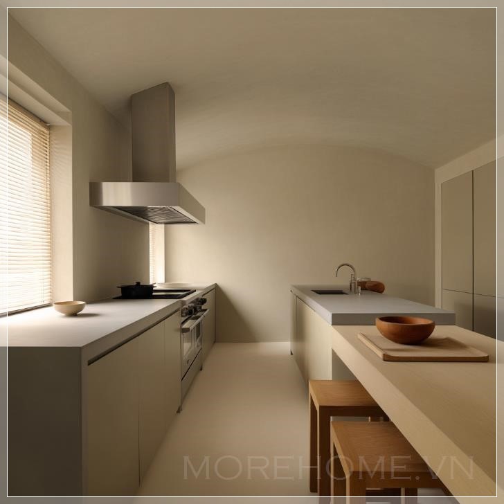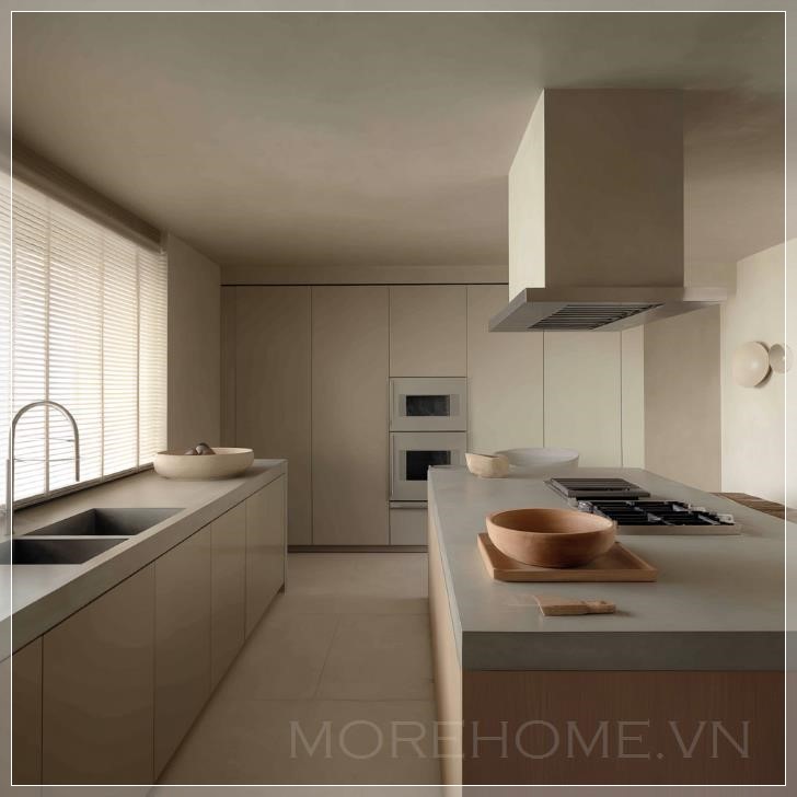 Ngôi nhà tối giản được thiết kế bởi John Pawson mang phong cách hiện đại tối giản, với các đường nét đơn giản, mượt mà và không có các yếu tố trang trí thừa thãi. Trần và tường được sơn với lớp sơn có kết cấu, đảo bếp sử dụng chất liệu gỗ ấm, tạo nên không gian tự nhiên. Mặt bàn đảo bếp được làm từ đá mờ có kết cấu, mang đến cảm giác bền vững. Máy hút mùi, lò nướng và các thiết bị khác được làm từ thép không gỉ, bền bỉ và dễ dàng vệ sinh. Các gam màu trung tính, be và nâu là tông màu chủ đạo của không gian, tạo ra một bầu không khí yên bình và hài hòa. Ánh sáng tự nhiên, cửa sổ được trang bị rèm, có thể điều chỉnh lượng ánh sáng vào phòng, giữ cho không gian luôn sáng sủa. Ánh sáng nhân tạo, hai chiếc đèn tường tròn được lắp trên tường, cung cấp ánh sáng phụ mềm mại. Bố trí không gian chức năng, thiết kế bàn làm việc theo hình chữ L tận dụng tối đa diện tích, thuận tiện cho việc nấu nướng và làm việc. Tủ và ngăn kéo rộng rãi cung cấp không gian lưu trữ phong phú, giữ cho bếp luôn gọn gàng và ngăn nắp. Một chiếc bát gỗ đơn giản và một thớt cắt được đặt trên đảo bếp, vừa có tính thực tế vừa mang tính trang trí.