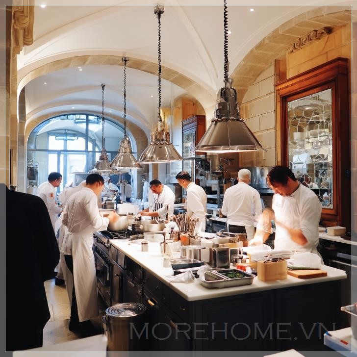 Trong không gian ấy, các thiết bị bếp hiện đại được sắp xếp một cách thông minh và tiện dụng. Bàn chế biến, lò nướng, bếp gas và các dụng cụ bếp khác được bố trí gọn gàng nhưng vẫn dễ dàng tiếp cận, giúp các đầu bếp có thể làm việc một cách nhanh chóng và hiệu quả. Từng chi tiết nhỏ trong nhà bếp, từ đèn chiếu sáng đến các vật dụng, đều được lựa chọn để tạo ra không chỉ không gian làm việc thuận tiện mà còn mang lại sự sang trọng, thanh lịch. Từ các bức tường màu sáng cho đến sàn gạch men bóng loáng, tất cả đều phản chiếu một phong cách kiến trúc Pháp cổ điển nhưng đầy hiện đại.