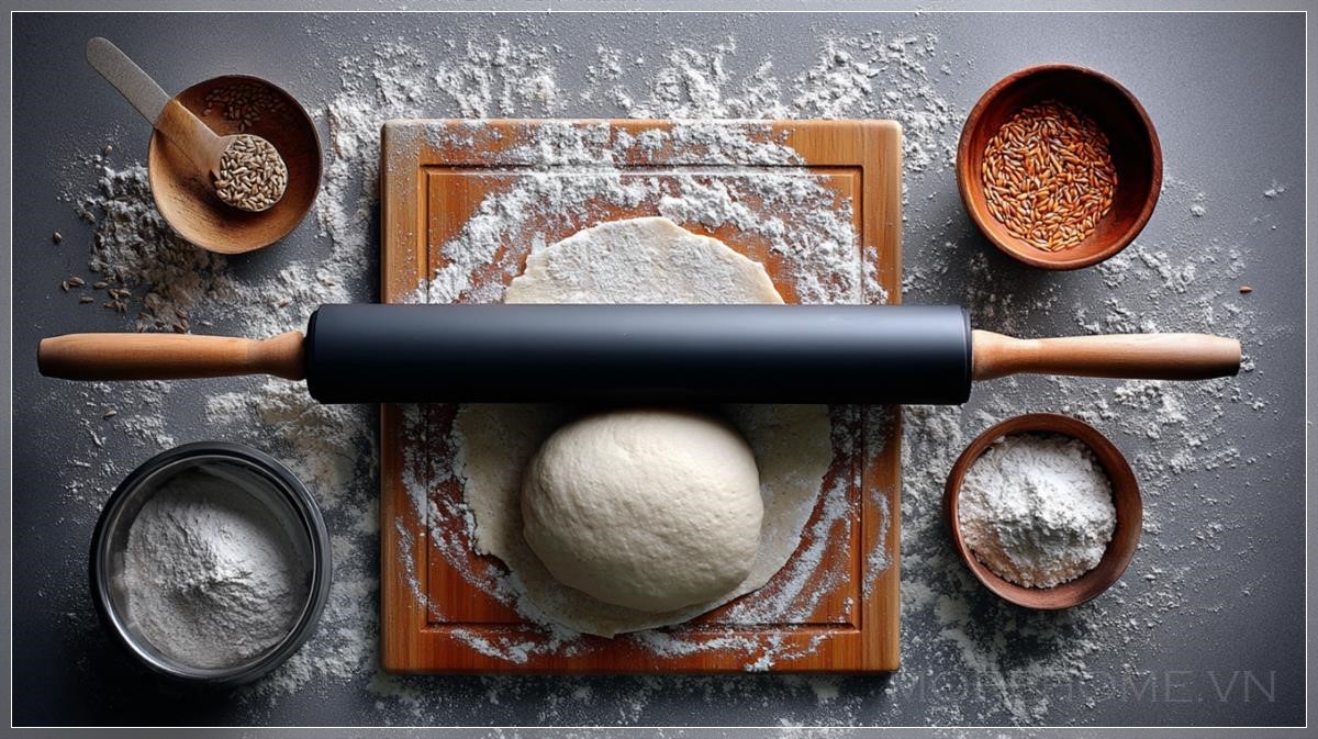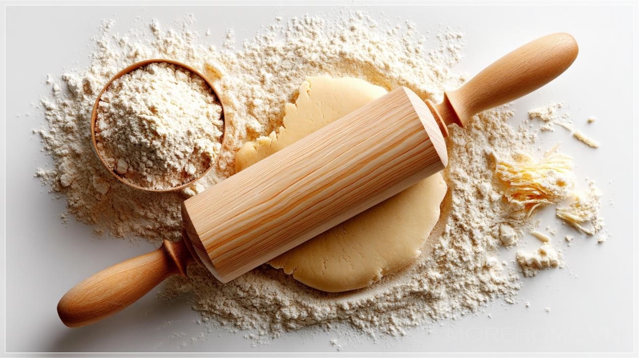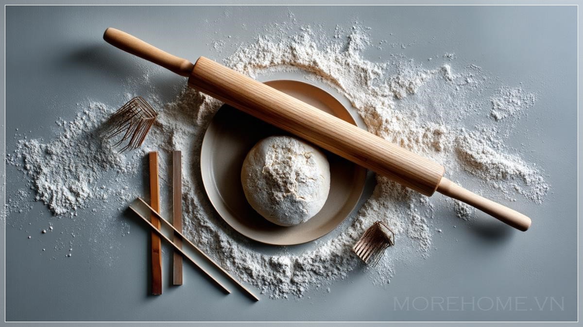 Không gian bếp, một nơi không chỉ để chuẩn bị những món ăn ngon mà còn là nơi để thưởng thức sự yên bình từ những khoảnh khắc đơn giản, như cảnh một cây rolling pin đang miết bột, với một lớp bột rơi vãi trên mặt bàn. Đó là hình ảnh của một không gian thiên nhiên thu nhỏ, được tạo ra từ những hoạt động hàng ngày, nơi mỗi chi tiết đều góp phần tạo nên một không khí thư giãn và gần gũi với thiên nhiên.