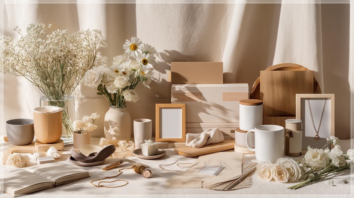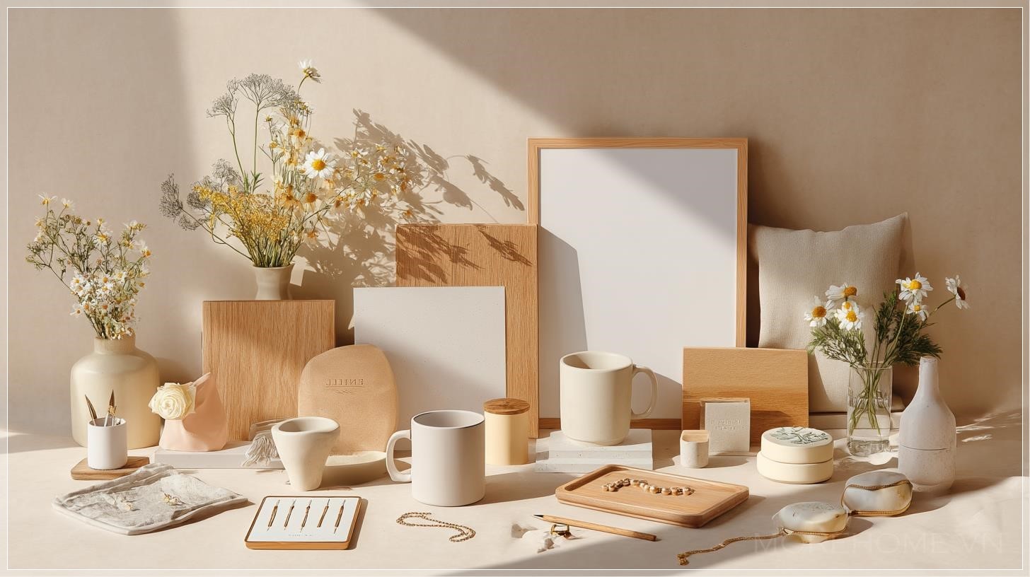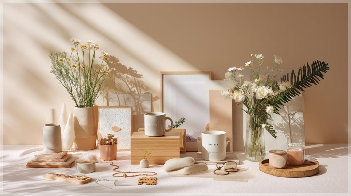 Với ánh sáng dịu nhẹ từ các nguồn sáng khuếch tán, không gian này mang đến một cảm giác yên bình và thư giãn. Tông màu chủ đạo là những sắc thái trung tính và pastel như beige, mang đến sự ấm áp và thanh thoát. Các chi tiết như bóng đổ mạnh và sáng rõ của vật dụng trong khung cảnh tạo nên hiệu ứng hình ảnh sắc nét, đồng thời làm nổi bật vẻ đẹp của những món quà được trưng bày.