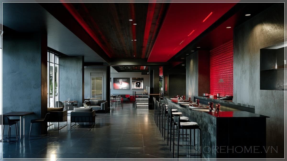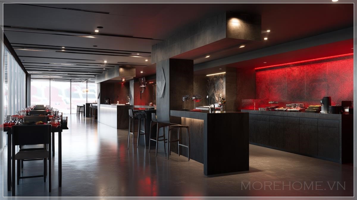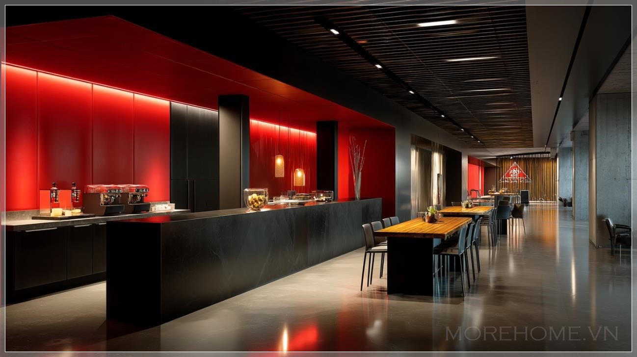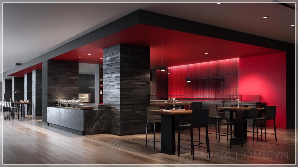 Không gian nội thất của các phòng VIP này mang vẻ đẹp tinh tế, với các đường nét kiến trúc mạnh mẽ, sử dụng những vật liệu cao cấp như gỗ đen, đá matte và kim loại chải. Điều này không chỉ tạo ra một không gian sang trọng mà còn giúp tăng cường sự chú trọng vào các chi tiết nội thất. Màu sắc chủ đạo là gam màu đen, kết hợp với các điểm nhấn màu đỏ, tạo ra sự đối lập mạnh mẽ nhưng cũng đầy ấn tượng. Những bức tường đỏ hoặc đèn chiếu sáng đỏ không chỉ làm nổi bật không gian mà còn đóng vai trò là những tuyên ngôn thương hiệu mạnh mẽ, gợi lên sự quyền lực và đẳng cấp.