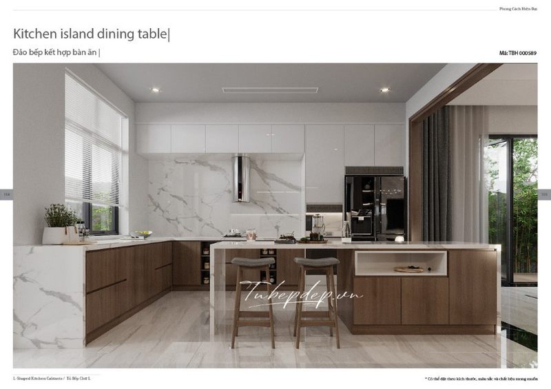 Bàn ăn nhỏ sang trọng và sáng tạo kết hợp với đảo bếp là một ý tưởng trang trí phòng bếp đẹp mắt dành cho các căn nhà, biệt thự.