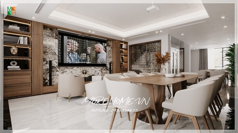 Mẫu bàn ghế ăn gỗ tự nhiên, màu nâu sáng và ghế ăn bọc da đẹp sẽ tạo nên không gian ấm cúng cho gia chủ.