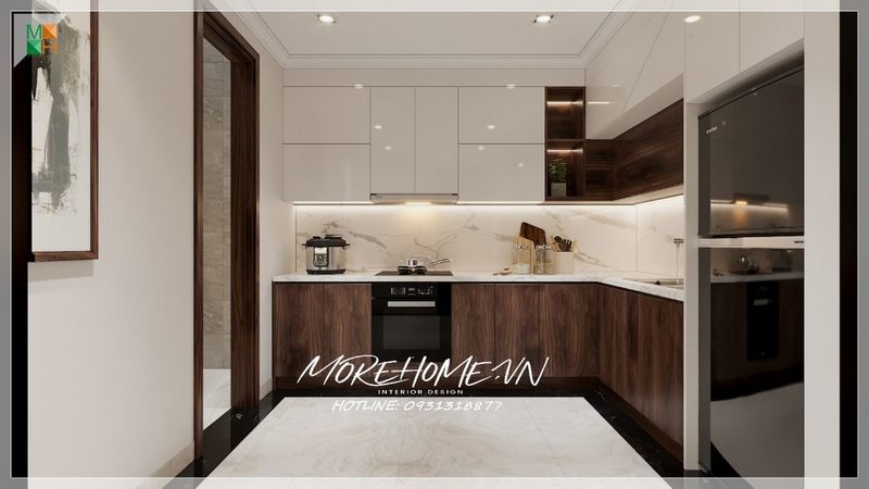 Mẫu thiết kế phòng bếp đơn giản nhưng vẫn có độ cao cấp, sang trọng, tiện nghi, phù hợp với các căn hộ, nhà phố, biệt thự theo phong cách hiện đại.